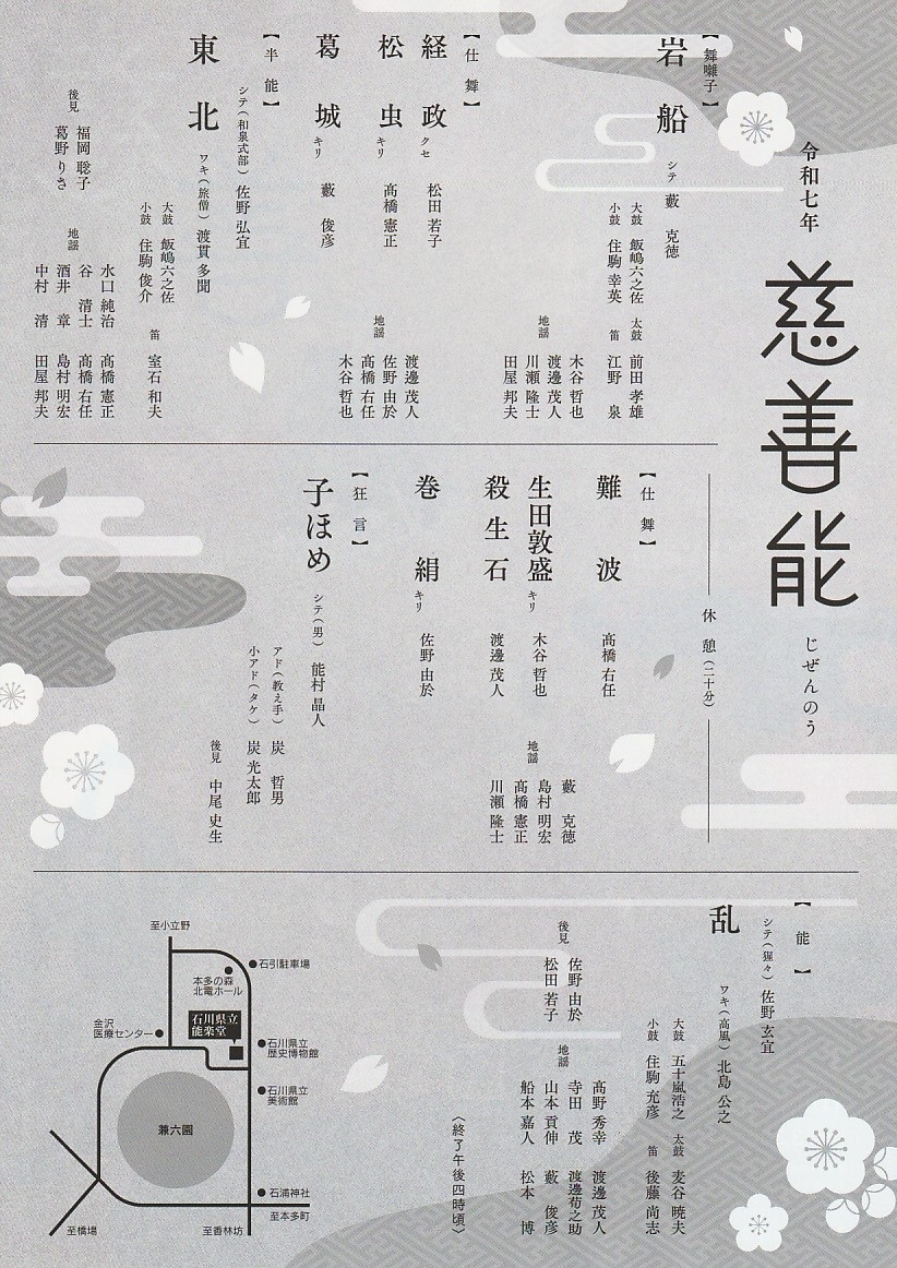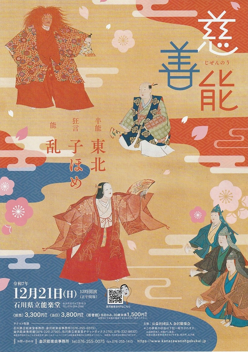令和7年 慈善能 2025年12月21日 令和7年 慈善能 舞囃子「岩船」 藪克徳 仕舞「経政クセ」松田若子 「松虫キリ」高橋憲正 「葛城キリ」藪俊彦 半能「東北」 佐野弘宜 渡貫多聞 室石和夫 住駒俊介 飯島六之佐 仕舞「難波」高橋右任 「生田敦盛キリ」木谷哲也 「殺生石」渡邊茂人 「巻絹キリ」佐野由於 狂言「子ほめ」 能村晶人 炭哲男 炭光太郎 能「乱」 佐野玄宜 北島公之 後藤尚志 住駒充彦 五十嵐浩之 麦谷暁夫 日時 12月21日(日) 午後1時開演(正午開場) 会場 石川県立能楽堂(金沢市石引4丁目18-3) 石川県立能楽堂へのアクセス方法 入場券 前売り一般 3,300円/当日 3,800円 若者割※(30歳未満・当日のみ) 1,500円 ※受付にて年齢を確認できるものをご提示ください。 ○お問い合わせフォームからチケットをご予約いただけます。 【お問い合わせ内容】欄にて「前売り券申し込み」をご選択いただき、【お問い合わせ内容詳細】欄に「公演名(〇月定例能など)」「必要枚数」をご記入のうえ、その他必要事項をご入力してお申し込みください。当日、会場受付にてお名前をお伝えいただき、前売り券の枚数分の代金と引き換えにチケットをお受け取りください。 お問い合わせフォーム 石川県立能楽堂、金沢能楽会事務所、能楽美術館、石川県立音楽堂チケットボックスにて前売り券を販売しております。 番組/解説