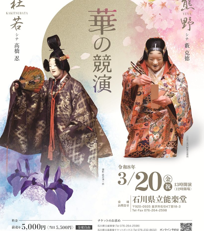令和5年 慈善能 2023年12月17日 令和5年 慈善能 舞囃子「鶴亀」 佐野弘宜 舞囃子「俊成忠度」藪 克徳 連吟 「羅生門」 仕舞 「氷室」 松田若子 仕舞 「小袖曽我」渡邊茂人 木谷哲也 仕舞 「蝉丸」 広島克栄 舞囃子「胡蝶」 福岡聡子 仕舞 「熊坂」 高橋右任 仕舞 「松風」 藪 俊彦 仕舞 「山姥キリ」 佐野由於 狂言 「骨皮」 能村晶人 炭哲男 炭光太郎 清水宗治 能村祐丞 能 「金札」 島村明宏 北島公之 中尾史生 日時 12月17日(日) 午後1時開演(正午開場) 会場 石川県立能楽堂(金沢市石引4丁目18-3) 石川県立能楽堂へのアクセス方法 入場券 前売り一般 3,300円/当日 3,800円 若者割※(30歳未満・当日のみ) 1,500円 ※受付にて年齢を確認できるものをご提示ください。 中学生以下 無料 ○お問い合わせフォームからチケットをご予約いただけます。 【お問い合わせ内容】欄にて「前売り券申し込み」をご選択いただき、【お問い合わせ内容詳細】欄に「公演名(〇月定例能など)」「必要枚数」をご記入のうえ、その他必要事項をご入力してお申し込みください。当日、会場受付にてお名前をお伝えいただき、前売り券の枚数分の代金と引き換えにチケットをお受け取りください。 お問い合わせフォーム 金沢能楽会事務所、石川県立音楽堂チケットボックス(10月18日より)で前売り券を販売しております。 番組/解説