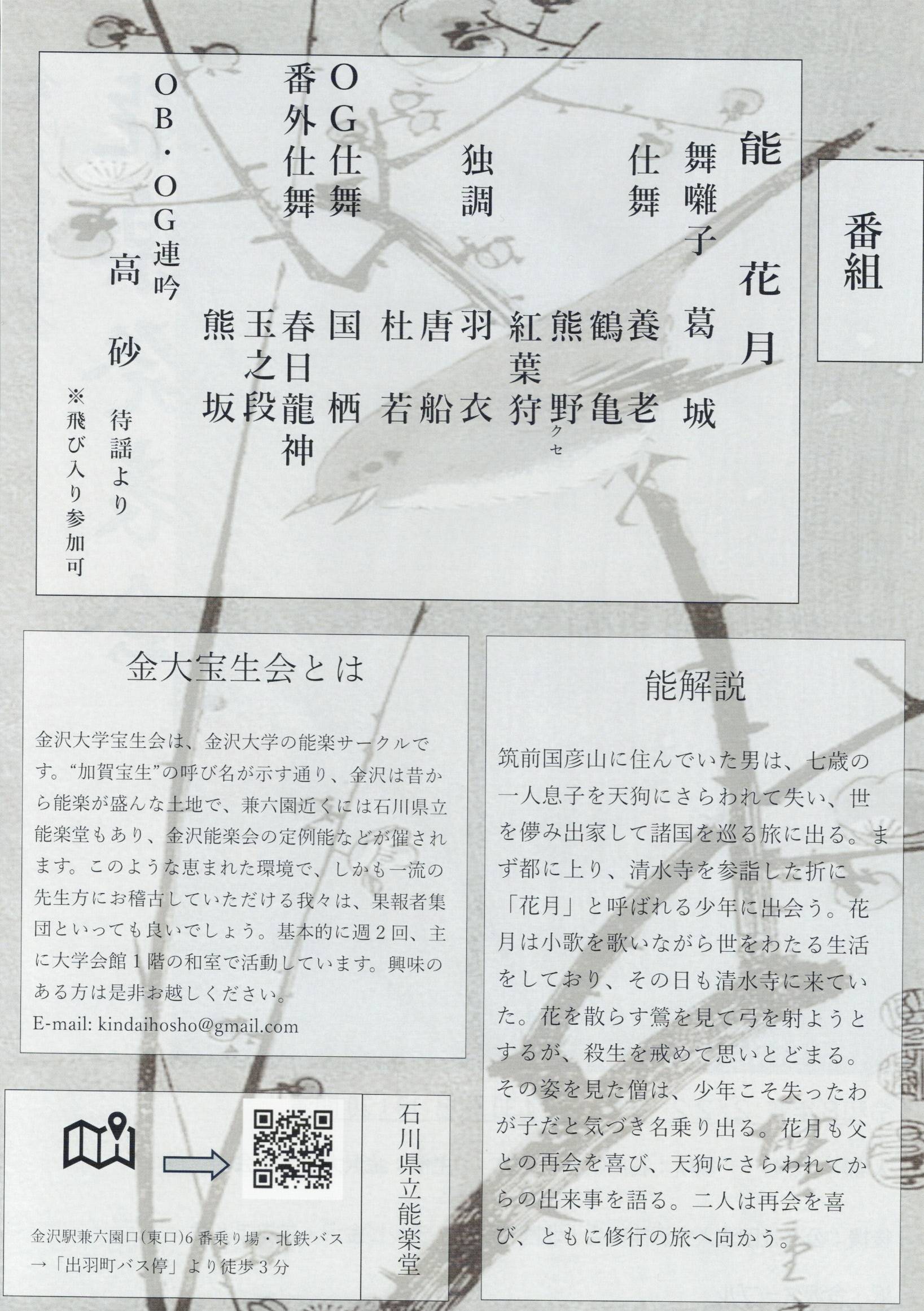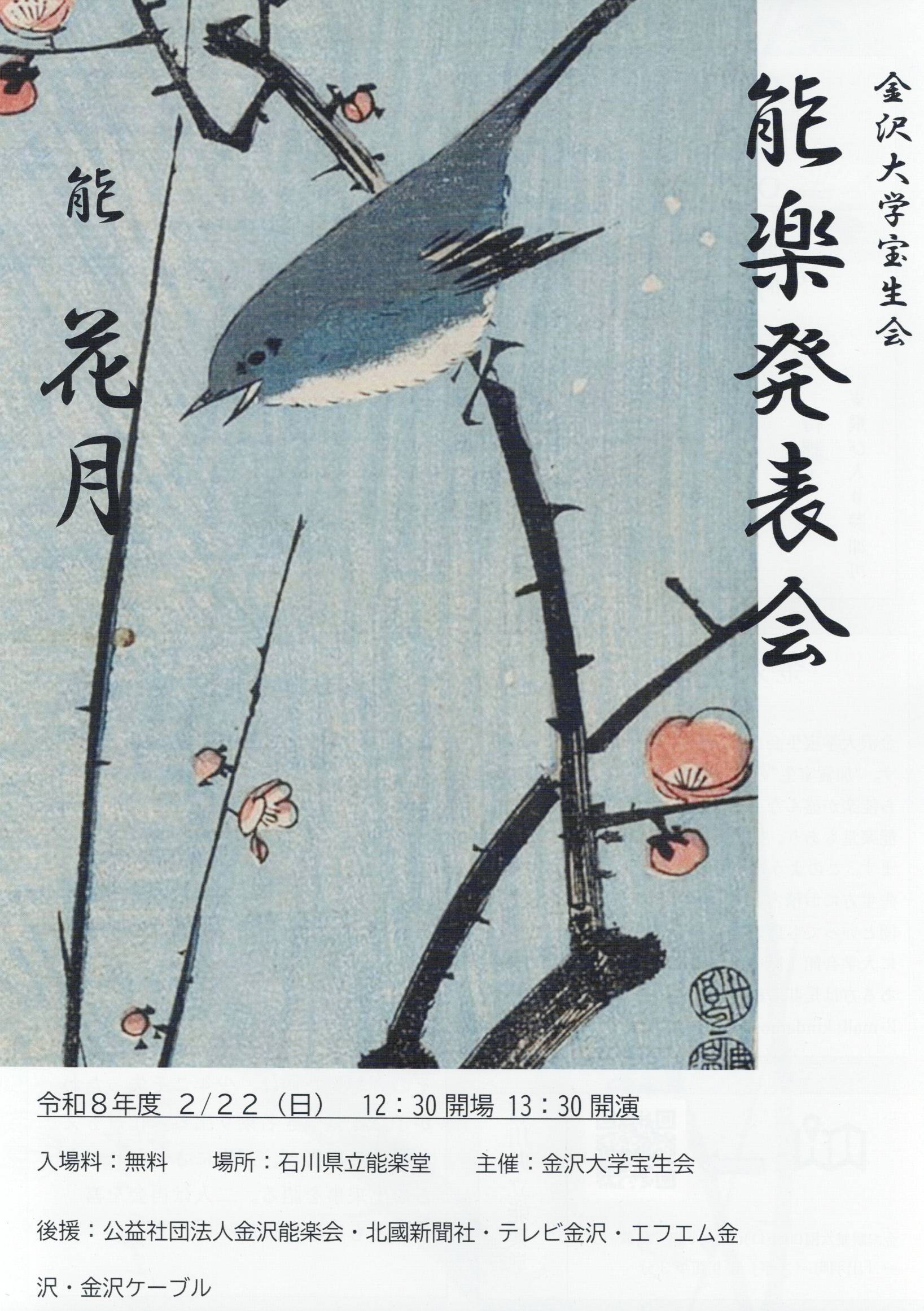 金沢大学宝生会 能楽発表会 2026年2月22日 金沢大学宝生会 能楽発表会 舞囃子「葛城」 仕舞「養老」「鶴亀」「熊野」「紅葉狩」 独調「羽衣」 独鼓「唐船」「杜若」 番外仕舞「春日龍神」「玉之段」「熊坂」 OBOG連吟「高砂」待謡ヨリ 能「花月」 日時 2月22日(日) 午後1時半開演(12時半開場) 会場 石川県立能楽堂(金沢市石引4丁目18-3) 石川県立能楽堂へのアクセス方法 入場券 入場無料 主催 金沢大学宝生会 詳細